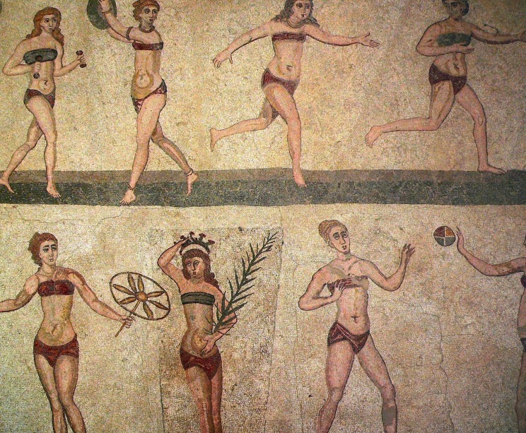 Die Bikini-Mädchen, ein berühmtes Mosaik oben gezeigt, aus der Villa Romana del Casale in Sizilien, zeigt Frauen, die Sport treiben, während sie enge Bandeaus tragen, die wahrscheinlich verhindern, dass die Dinge zu viel herumspringen. Junge Mädchen verwendeten manchmal Brustbänder, Strophium genannt, um ein Durchhängen zu verhindern, das die Römer mit Alter und Unattraktivität in Verbindung brachten.
